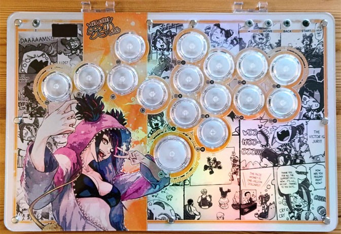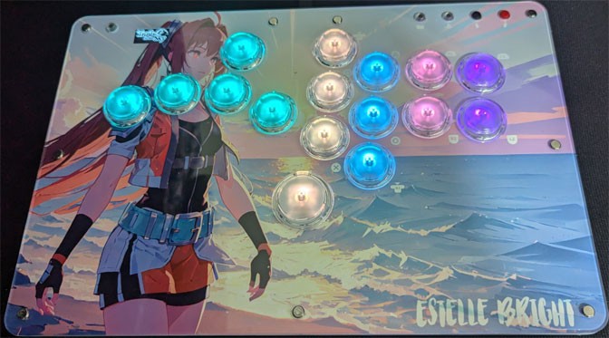 Due to the simple acrylic panels that sandwich everything together, you can print and make your own customized artwork for the front and back of the R16 fight stick pretty easily. Of course, this was an alluring factor for me since I’m a graphic designer, but carefully cutting everything away until I had my own artwork layered underneath the acrylic panels was great. Placing artwork underneath the buttons took considerably more effort, however. You can also replace the switches if you need and can use your own art for the boot up screen on the stick, as well, though the image needs to be legible in black and white.