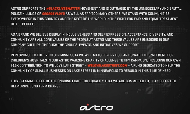The reality of the situation is that people are protesting and it’s turning violent due to people who are using our grief for personal gain. With that being said, there are some people who are behind us, at least for emotional support. Like AstroGaming, they do sponsor a few Black gamers. I have met many figure heads at AstroGaming and they seem to understand what is important. Brandon Leuner, community manager of AstroGaming said,