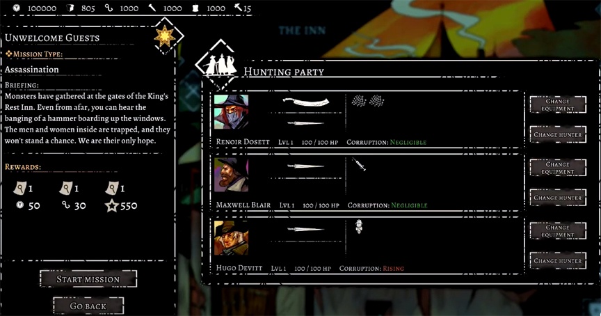 Gameplay also presented some issues that I want to complain about. The first was when I gave a hunter a gun so that I could have a second gunslinger on my four man team, but he would not use the weapon at all. I could not find any reason why this person could not use the firearm. Secondly, every hunter gained corruption (which operates similar to madness if you play pen and paper Call of Cthulhu) from every battle and every kill. While you can sacrifice a severely addled hunter and transfer their power to someone else, it felt like I was being punished for using my people. Plus, that’s kind of an evil act, so shouldn’t I get corruption for doing that?