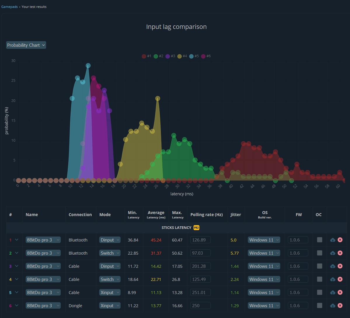 Effectively every single other mode of the 8BitDo Pro 3 has great to reasonable latency except D-input mode over Bluetooth, which reaches 45ms of input delay on analog sticks from my latency tests (with other reviewers getting results at high at 72ms!). Using the 2.4GHz connection on both a Nintendo Switch and PC feel perfect, and exactly what a controller should be, but for some reason D-input mode’s Bluetooth latency just has considerably higher latency than every other mode of the controller. The Pro 3 over 2.4GHz responds quite quickly at 14ms, it’s unfortunate that D-input mode can’t benefit from the more stable, faster connection for use with Steam Input support on PC.