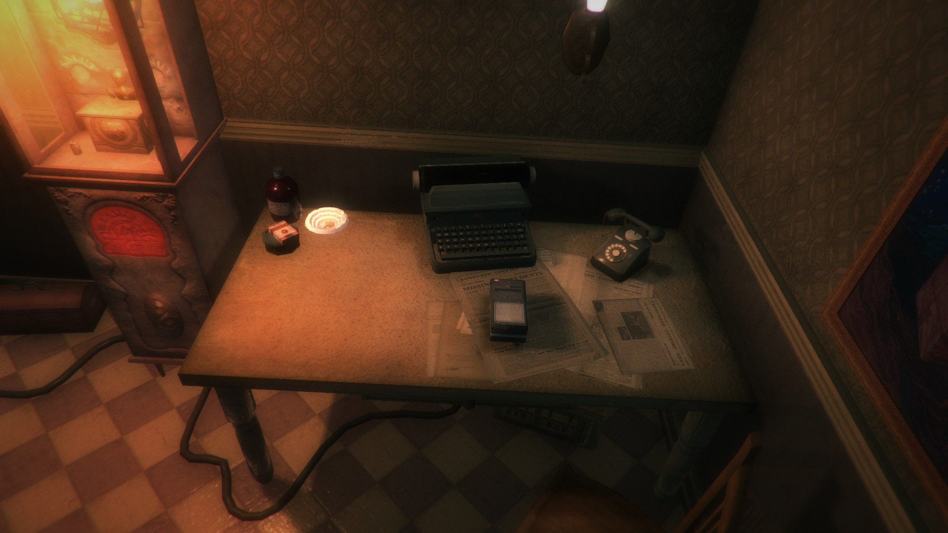 Besides just walking around and solving puzzles, the gameplay is straightforward with movement and interacting with objects — plus you even can craft items. Before crafting is introduced, the player needs to find items like keys to get into locked rooms. You don’t get any monsters or injuries until you begin crafting bandages. Crafting lock picks get you into locked doors but even those are timed challenges. Maps can also be crafted after a certain stage. Except for keys, items you pick up stay in your inventory that can be accessed anytime. Also in the same inventory are your notes and recordings.