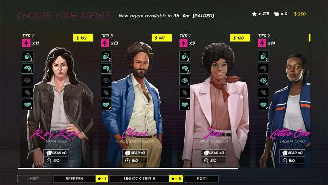 You’ll hire a wide variety of new agents, and you’ll get a quick sense of who they are based on their portraits and mottos. You’ll be able to deploy these agents as you see fit, and each of these characters has a story. However, despite that variety, the game does feature a guiding narrative that you’ll work through as the title progresses.
